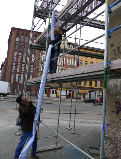 Dank der Aachener SWG war es möglich, an das Haus Osloer Str. Ecke Prinzenallee einige großflächige Banner zu hängen.
